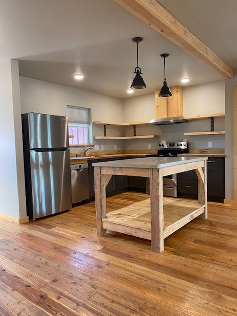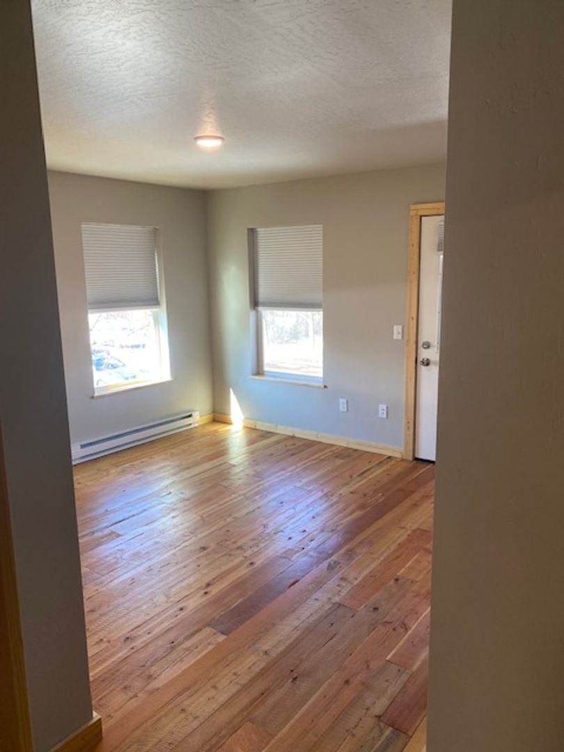 4 bedroom, 1 flex room, 3.5 bathroom, three level town home. Corner unit boasting well situated windows for excellent natural light on all floors. Over 2,300 square feet across three levels makes this corner unit feel like home. Main floor features both street and alley access- covered deck porch on street side and alley side. Alley side is south facing so it's perfect for those sunny BBQs and hanging out. Open floor plan on the main level with exposed beams combined with rustic hand hewn wood floors creates an inviting space. Upstairs continues with wood floors. Two bedrooms share an over sized bathroom with double vanity and separate toilet/shower area ideal for a common bathroom. The upstairs master suite has a walk-in closet and private bathroom with shower. Additionally, the upstairs master suite has its own covered deck with great north facing views of Snow bowl. The basement holds one dedicated bedroom with a large walk-in closet. At the base of the stairs you'll find a flex room which could easily be the fifth bedroom or used as a living area, office or gym. The basement has a full bathroom. Tucked underneath the stairs is a neat nook space that could be used as a small seating area with a desk, children's art space or storage. A large utility room with washer and dryer hookups rounds out the basement features.